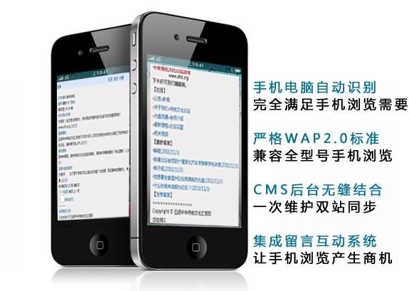 1、WAP2.0标准编写兼容全部WAP手机浏览2、系统与主站cms系统全集成3、内容性维护一次性完成4、WAP网站同时实现互动咨询功能5、费用低可扩展空间大