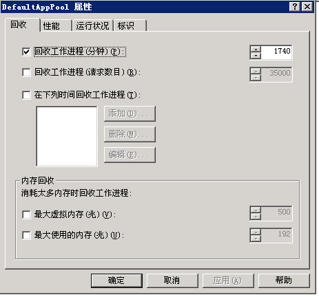 一、打开IIS6,选中应用池右键,选择“属性”菜单项,会弹出如下图的对话框。