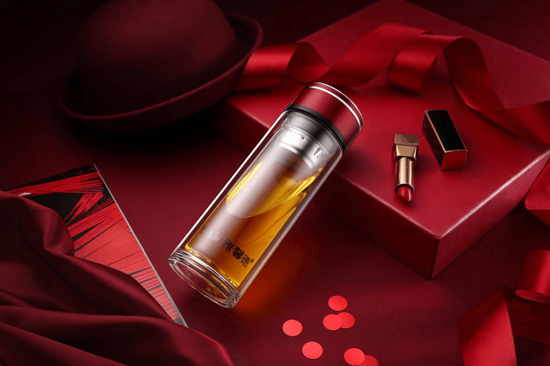 明暗对比越强烈,给人的差异化越大。主体物变明,背景变暗,就达到了我们突出主体物的效果。例如下图像暗红色和鲜红色,产品表面的高光和阴影,茶叶的暗黄色和亮黄色,盒子表面的高光白和阴影,口红的光影等等,这些都是和明暗对比息息相关的。