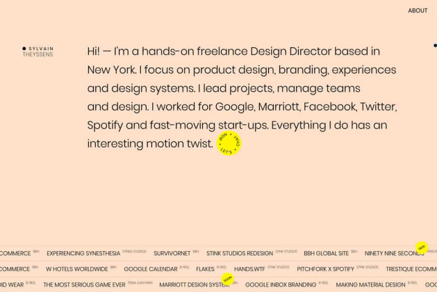 Sylvain Theyssens在他们的网站上和好的做到这点(它实际上包含了两个页面:一个可爱的“屏幕保护程序风格”动画,通过鼠标移动进入主要设计。)页面简单,信息丰富,令人印象深刻。 单屏设计为你提供了所需的一切,没有额外不必要的干扰。